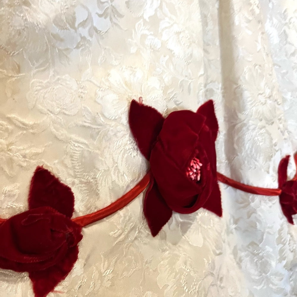 KILLER 1950’s formal party tea length fit and flare red velvet dress with petit coat attached underneath. The lace skirt is a cream color and the rose appliqués are stunning in person! The inside lining is red satin and there’s a metal zipper closure in the back. No makers tag inside. Fits a Medium
